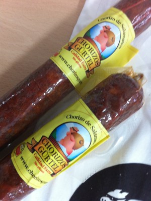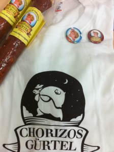 Esta mañana de resaca EBE, llego a la oficina de Tierras de José María El Tempranillo, y encuentro sobre una de las mesas de mis compañeros, un saquito que llama mi atención, pregunto, y mis compañeros sonrien…  uno de ellos  me dice: «Miralo, te va a encantar»… Me aproximo al saco, el estampado de la tela promete.. «Chorizos Gürtel», lo primero que pienso y digo es: «¿A quien le debemos dinero? ¿Es esto una nueva y creativa versión del cobrador del frac?»  Risas generalizadas… abro el saquito, que está cuidadosamente cerrado con una cuerdecita, y encuentro dos chorizos, 2 chapas y una camiseta de los más sugerente…