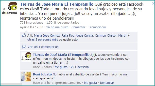 Esta mañana al administrar una de las páginas que gestiono, unos numeritos nuevos llamaron mi atención… Bajo cada publicación del muro, podemos ver el número de impresiones y el porcentaje de comentarios que tiene cada actualización de estado. Los datos tardan unas horas en aparecer, solo podemos ver información de las publicaciones del dia anterior, imagino que el sistema necesita un minimo de tiempo para poder establecer correlación entre impresiones y comentarios, dado que muestra datos porcentuales.